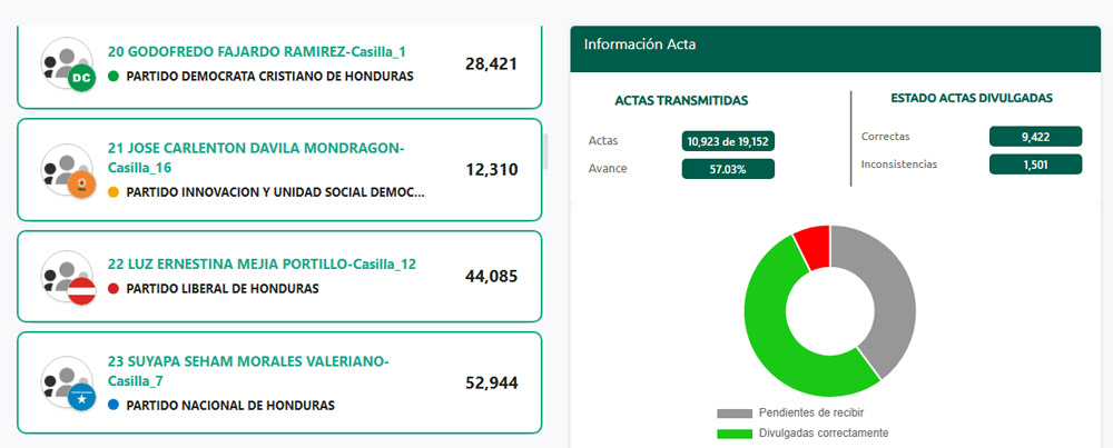 Tegucigalpa – Con el 57 % de las actas escrutadas en el nivele electivo legislativo, los candidatos Godofredo Fajardo, de la Democracia Cristiana (DC), y Carlenton Dávila, de Innovación y Unidad (Pinu-SD), pugnan por una curul en el próximo Congreso de la República.