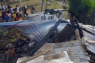 El helicóptero, color azul y gris y con matrícula HR-ANS, era piloteado por el capitán Walter Paz y el copiloto Carlos Mendoza, quienes también resultaron ilesos, mientras la pareja presentaban golpes en el abdomen y en el tobillo, pero no son de gravedad.
