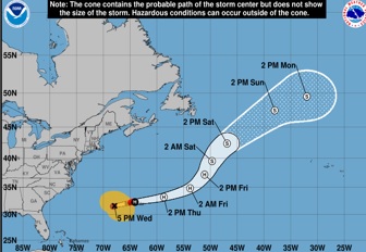 El NHC proyectó que Imelda se convierta en una baja extratropical más tarde este jueves, con «un pronóstico de debilitamiento gradual para los próximos días».