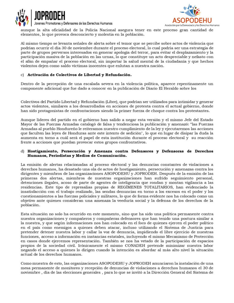 Tegucigalpa – La Asociación de Jóvenes Promotores y Defensores de Derechos Humanos (Joprodeh) y Asociación por la Democracia y los Derechos Humanos de Honduras (Asopodehu), emitieron hoy una alerta por una serie de eventos que amenazan el proceso electoral.