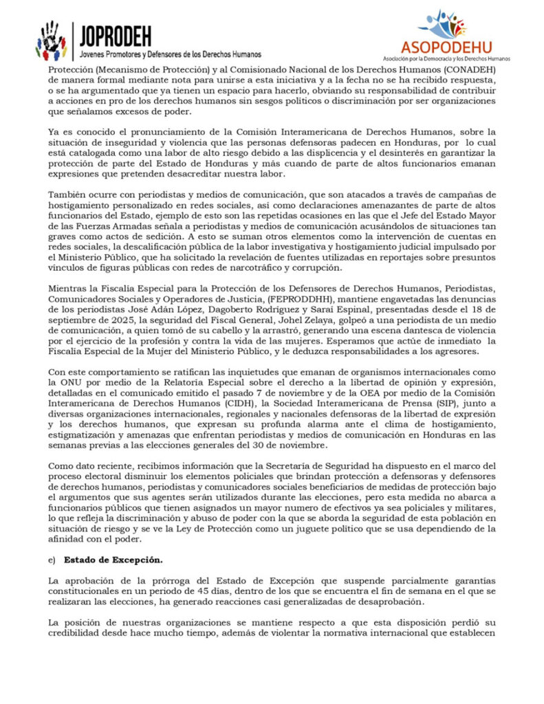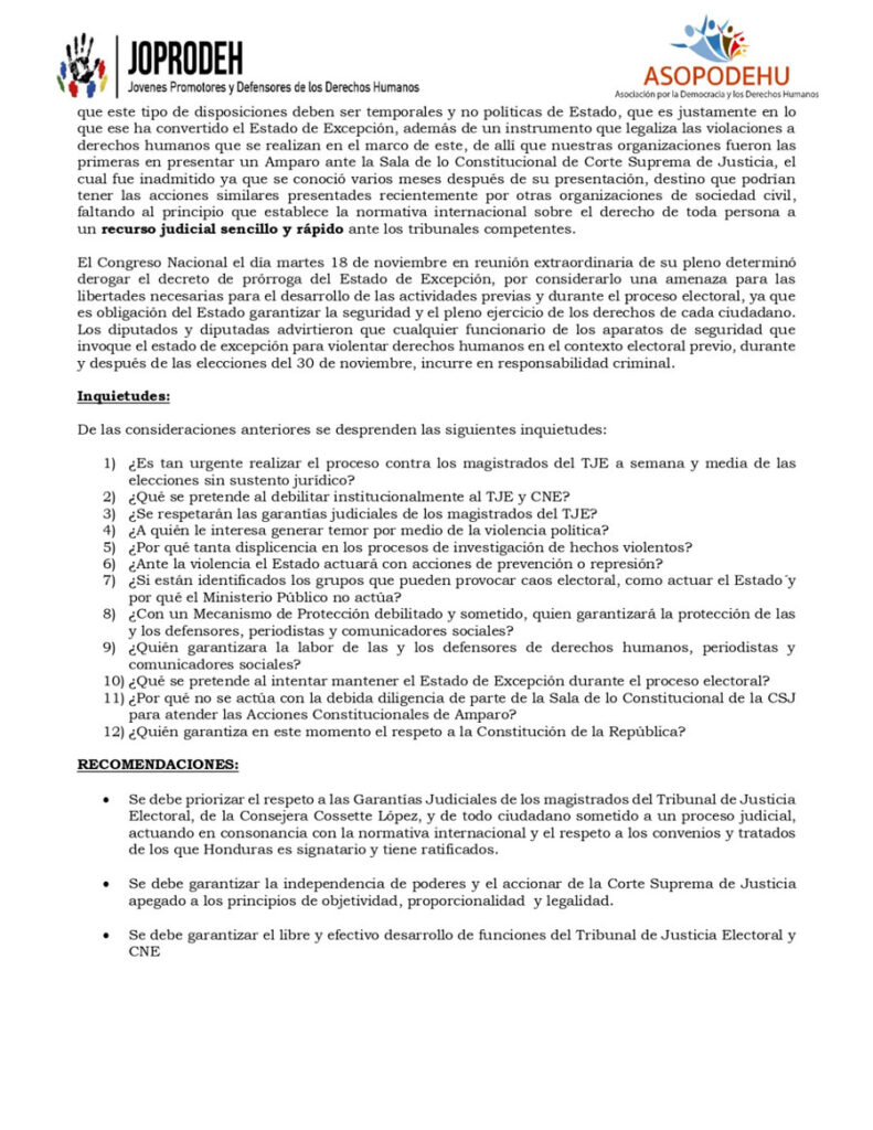 Las dos organizaciones expusieron que son elementos de análisis: la acción judicial contra magistrados del Tribunal de Justicia Electoral (TJE) y descrédito contra el Consejo Nacional Electoral (CNE); incremento de violencia política; activación de colectivos de Libertad y Refundación; hostigamiento, persecución y amenaza contra defensores y defensoras de derechos humanos, periodistas y medios de comunicación; y el estado de excepción.