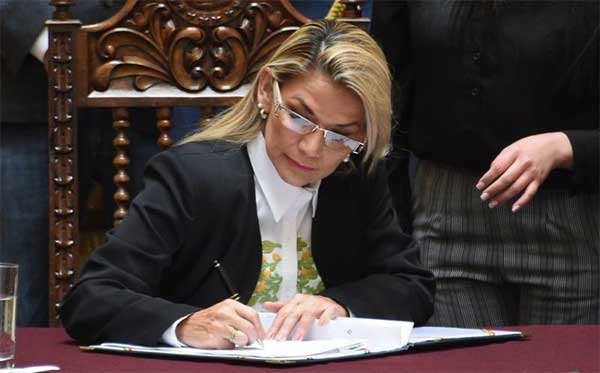 La presidenta interina promulgó la ley acompañada por la presidenta del Senado boliviano, Eva Copa, del partido de Morales, el Movimiento al Socialismo (MAS), que tiene mayoría en el Parlamento.
