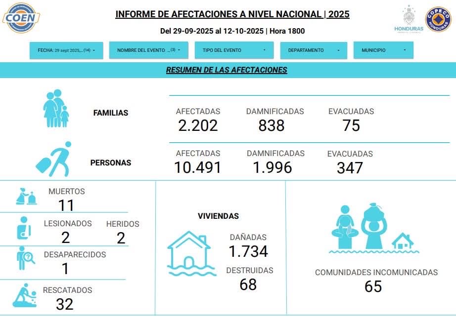 Entre las causas de muertes, Copeco señala que 10 fallecieron ahogados y 1 por la caída de un árbol, siendo Francisco Morazán, Intibucá y La Paz los departamentos con mayor incidencia.