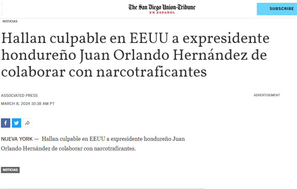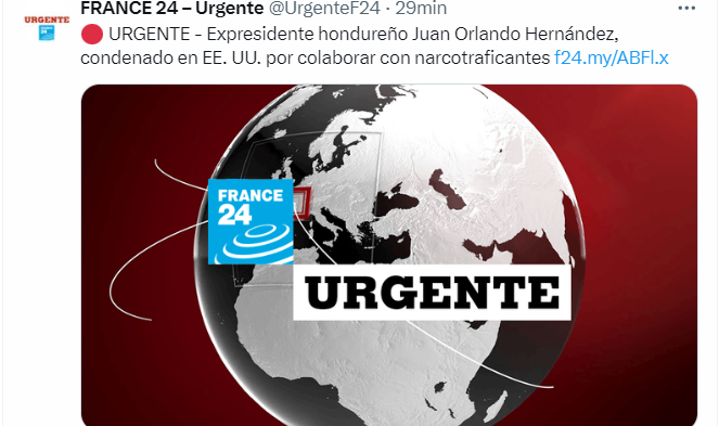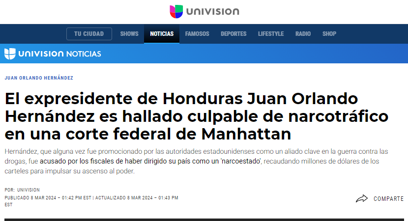 Tegucigalpa – Los medios de comunicación internacional registraron la decisión de los 12 jurados de la Corte del Distrito Sur de New York de culpabilidad por tres cargos al expresidente Juan Orlando Hernández este mediodía.