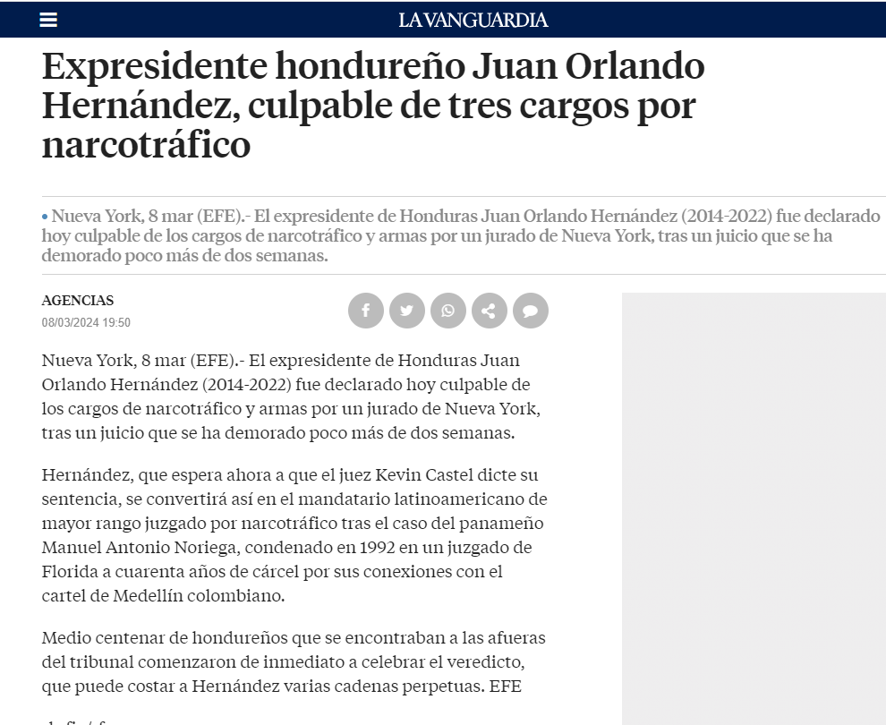 El juzgamiento y condena del exgobernante de Honduras constituye un hecho inédito para Honduras y para toda la región y abre la vía que causas similares se repitan debido a que la narcoactividad sigue en ascenso en Latinoamérica y con ello las causas sociales que desencadenan violencia, masiva migración irregularidad, corrupción y otra serie de desgracias para la población.