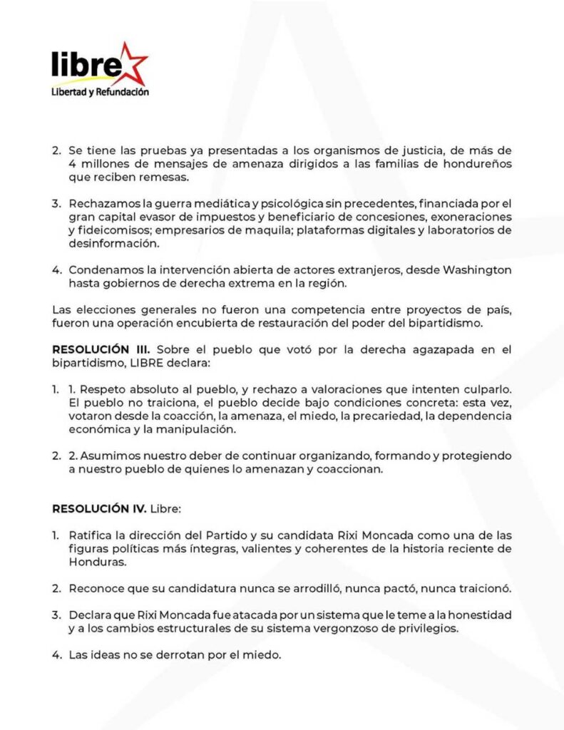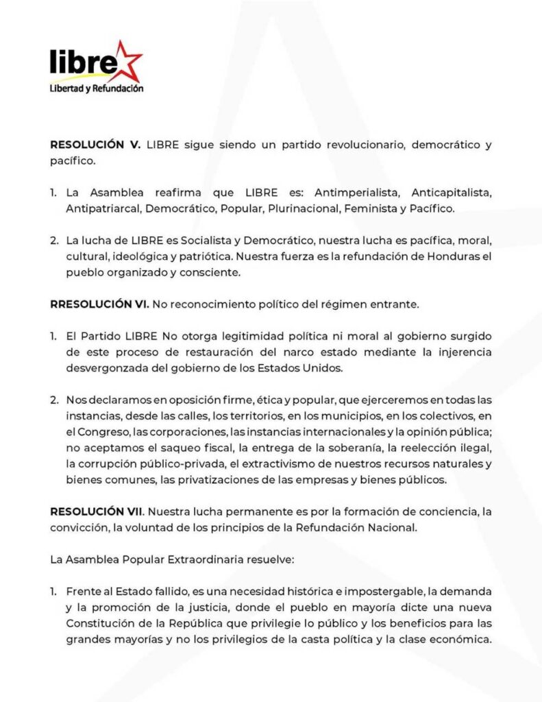 «El Partido Libre no otorga legitimidad política ni moral al gobierno surgido de este proceso de restauración del narcoestado mediante la injerencia desvergonzada del gobierno de los Estados Unidos» y se declara «oposición firme ética y popular que ejerceremos en todas las instancias», según una resolución leída este sábado.