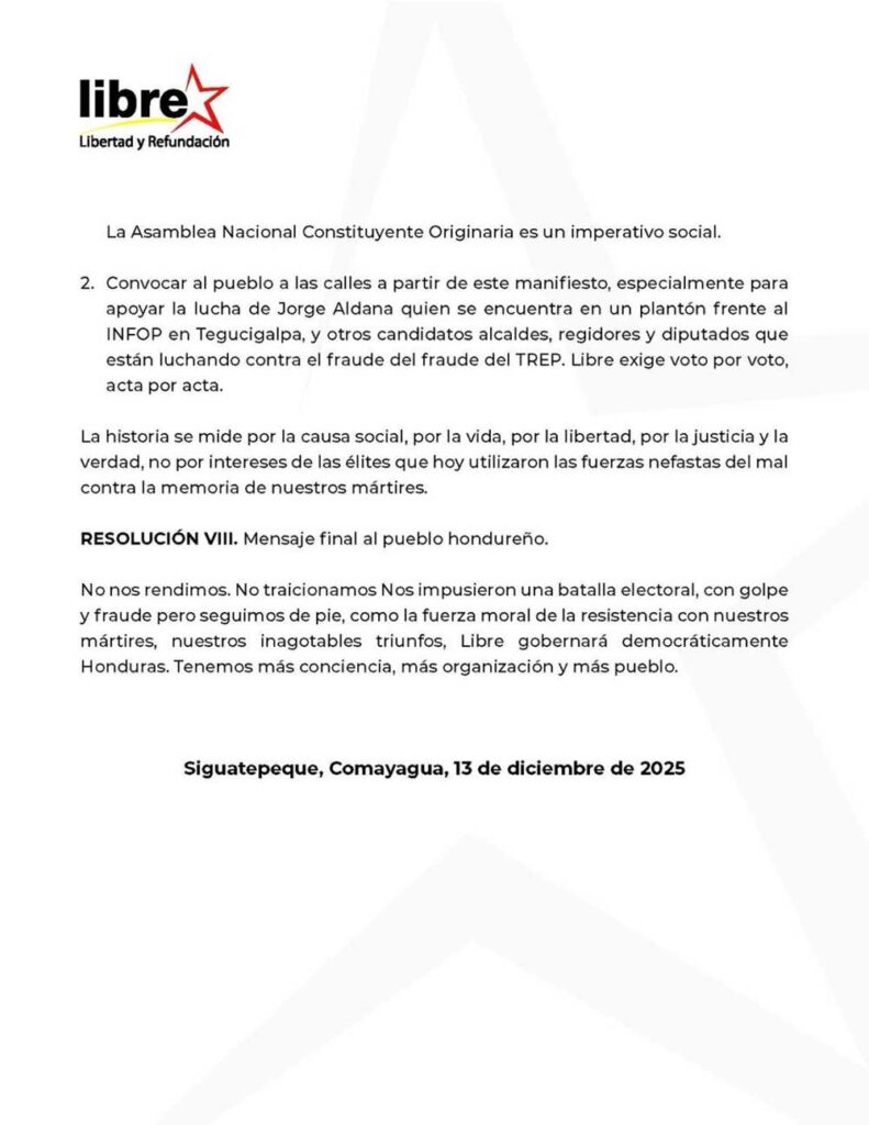 En una de las resoluciones, convocaron al pueblo a las calles a partir de este momento, especialmente para apoyar la lucha de Jorge Aldana, que se encuentra en un plantón frente a las bodegas electorales de Infop en la capital hondureña. Libre exige voto por voto, acta por acta.
