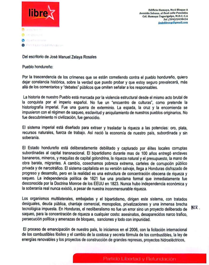 “Nuestra historia es de Resistencia y nunca será derrotada: al pueblo hondureño expongo la forma estructural de dominación del capital y el imperio en Honduras”, enunció Zelaya al compartir dos cuartillas escritas por él sobre este tema y volvió a ponderar a la perdedora candidata de Libre, Rixi Moncada, como la que propuso una opción viable para el desarrollo nacional.