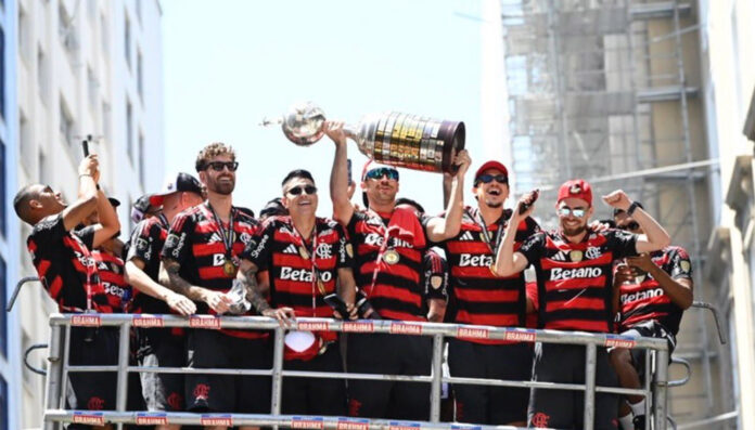 Escoltados por algunos vehículos de seguridad y por una caravana de decenas de motos conducidas por flamenguistas, los jugadores llegaron, media hora después (¡por fin!), a su destino, donde miles de aficionados que esperaban al Flu en el centro de la ciudad explotaron de éxtasis y felicidad al ver a su equipo, el primer conjunto brasileño en levantar cuatro veces la Copa Libertadores.
