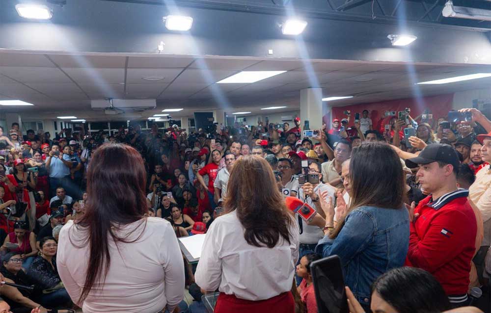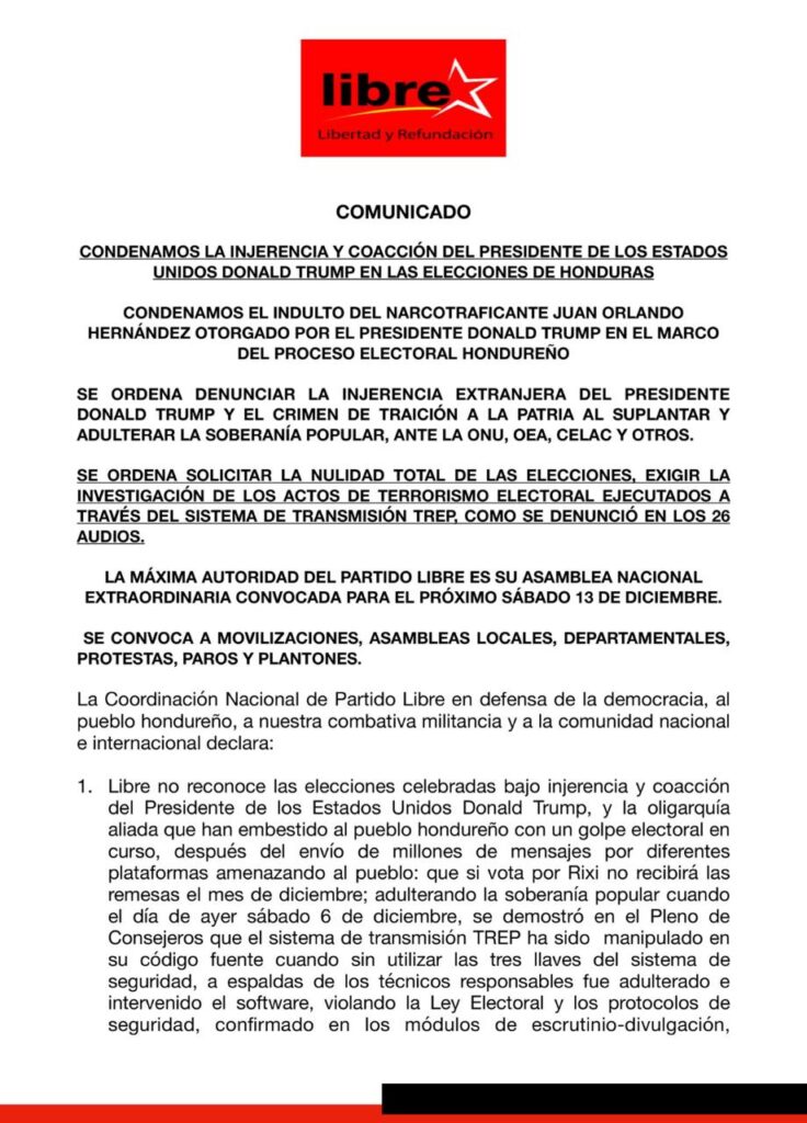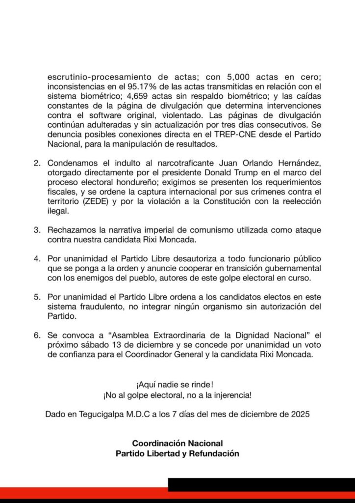 Moncada compareció ante una escasa y agotada militancia que se mantuvo durante unas 8 horas en la sede de Libre, donde el directorio del partido se reunió y compareció alrededor de las 8.30 de la noche del domingo para volver a rechazar lo que consideran el intervencionismo de los Estados Unidos en las elecciones hondureñas.