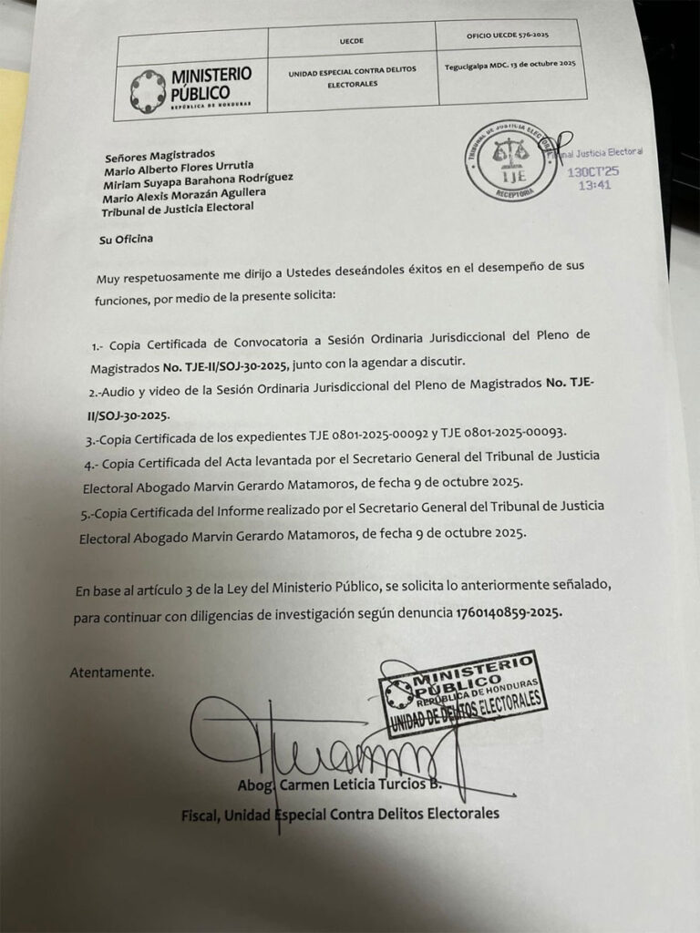 Tegucigalpa – El Ministerio Público pidió a los magistrados del Tribunal de Justicia Electoral (TJE) que remitan la documentación para investigar las denuncias de irregularidades en este organismo.
