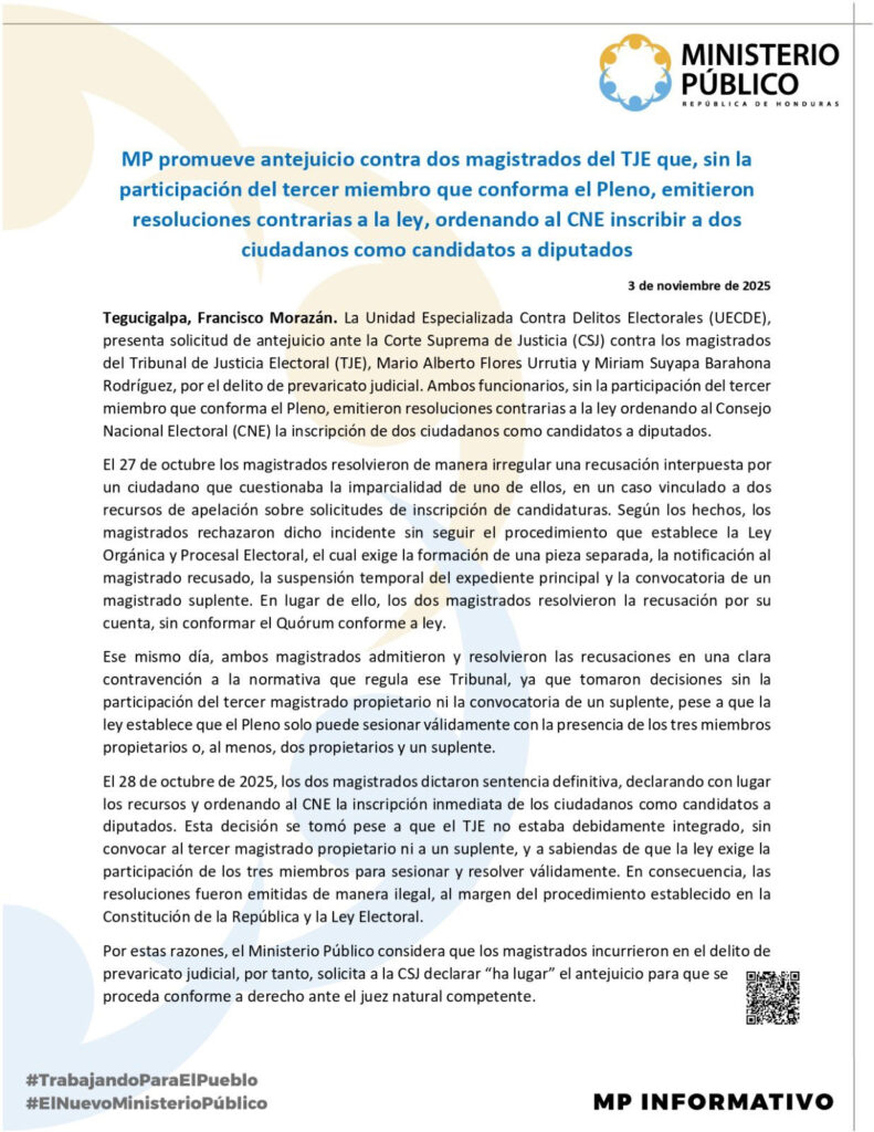 Tegucigalpa – La Unidad Especializada Contra Delitos Electorales (UECDE), presentó solicitud de antejuicio ante la Corte Suprema de Justicia (CSJ) contra los magistrados del Tribunal de Justicia Electoral (TJE), Mario Alberto Flores Urrutia y Miriam Suyapa Barahona Rodríguez, por el delito de prevaricato judicial.