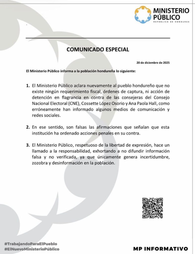 Tegucigalpa- El Ministerio Público afirmó que no existe ningún requerimiento fiscal, órdenes de captura, ni acción de detención en flagrancia en contra de las consejeras Cossette López y Ana Paola Hall.