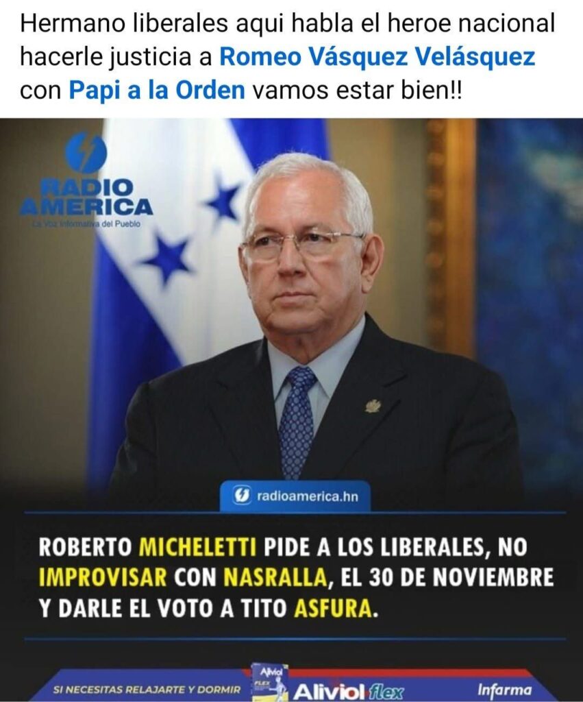 Entre ellos, destaca un diseño que adjudica al expresidente Roberto Micheletti un mensaje pidiendo el voto para Nasry Asfura, y no para Salvador Nasralla, actual candidato liberal. Micheletti declaró la falsedad de la información y pidió apoyo al candidato de su partido
