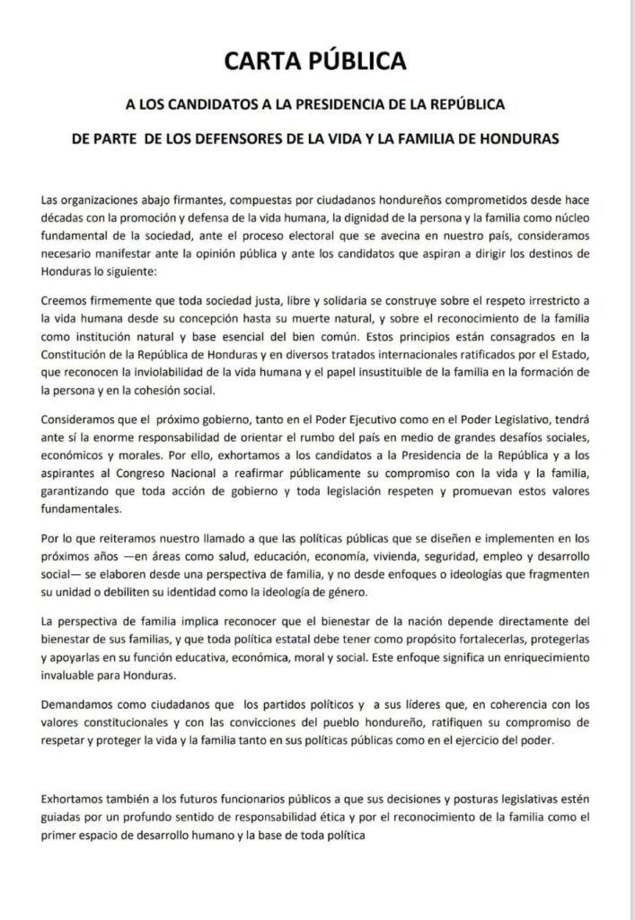 “Hemos enviado una carta pública 16 organizaciones civiles, religiosas, de mujeres, estamos pidiendo que los candidatos políticos tengan como centro de sus políticas públicas a las familias”, indicó Martha Lorena Alvarado del comité Pro Vida, una de las organizaciones que participa en el pronunciamiento.