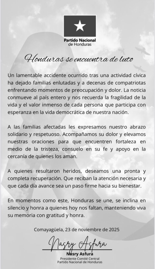 Un trágico accidente ocurrido tras una actividad cívica ha llevado luto a numerosas familias hondureñas. Hoy, el país entero acompaña con respeto y solidaridad a quienes enfrentan este dolor inmenso, señala el comunicado.