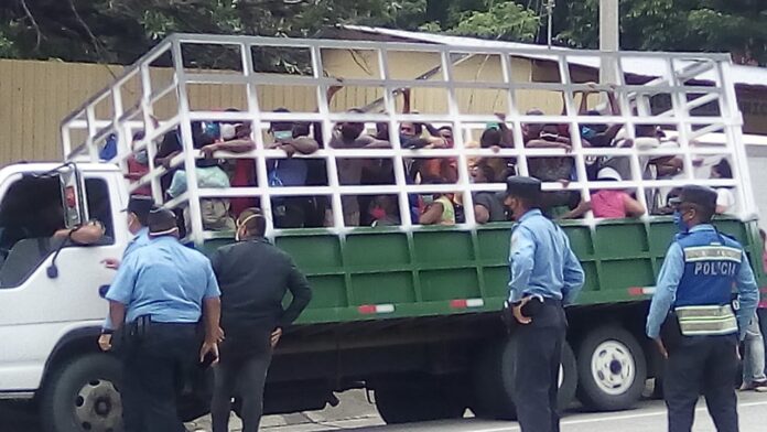 Los migrantes que se transportan en un vehículo tipo camión, color verde y blanco, decidieron salir de la ciudad de Choluteca tras permanecer unos tres meses varados a raíz de la emergencia COVID 19.