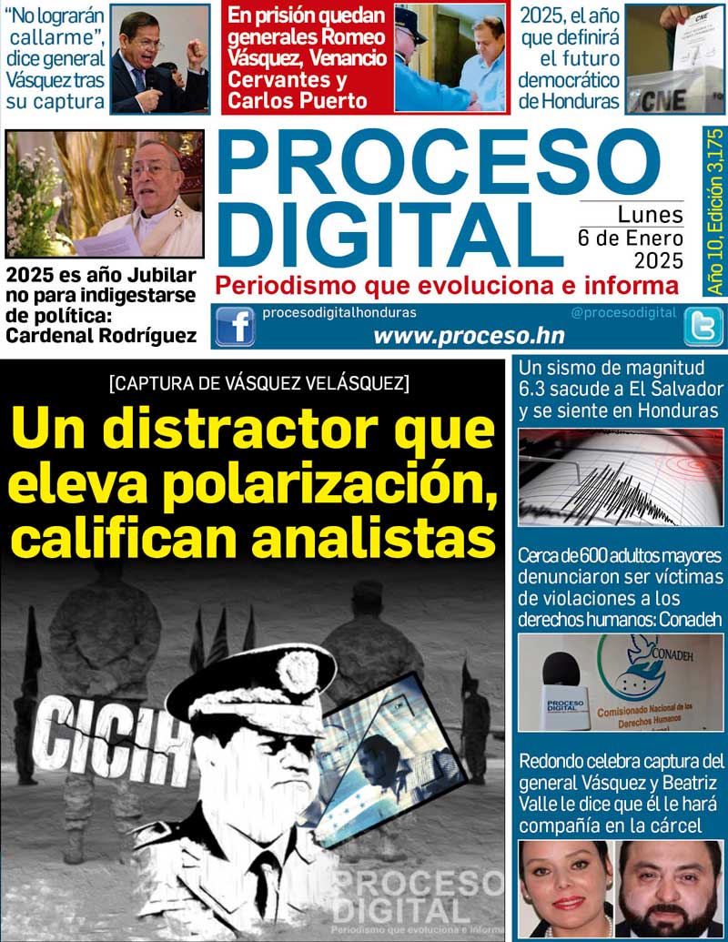 Portada DigitalPortada Lunes 06.01.2025Por: Proceso Digital5 de enero de 2025FacebookTwitterWhatsAppEmailImpresión Noticias recientes PolíticaNasralla insiste en el voto por voto tras ser descartado por el CNE PolíticaEl partido perdedor está aprovechando la degradación política, escrutinio debe de iniciar: Arístides Mejía Portada DigitalPortada Miércoles 17.12.2025. PolíticaCNE agrega 553 actas para conteo especial PolíticaJuan Diego Zelaya pide a la OEA, UE y a EEUU estar vigilante ante un posible autogolpe de Estado
