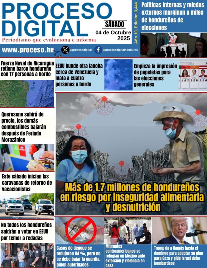 Portada DigitalPortada Digital, Sábado 04 de Octubre, 2025Por: Proceso Digital3 de octubre de 2025FacebookTwitterWhatsAppEmailImpresión Noticias recientes FarándulaTaylor Swift rompe récord de streaming en Spotify, en el primer día de estreno de su disco PolíticaNasralla denuncia seguimiento y vigilancia de su campaña de parte del gobierno Liga NacionalCon triplete de Messiniti, Marathón vence al Juticalpa y sigue de cerca al Olimpia NacionalesMás de 1.7 millones de hondureños en riesgo por inseguridad alimentaria y desnutrición Ciencia y TecnologíaPrueban con éxito una vacuna contra un herpes letal para los elefantes