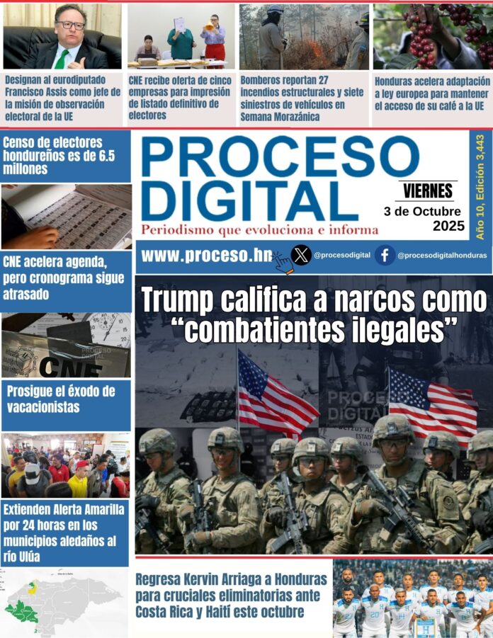 Portada DigitalPortada Digital, Viernes 03 de Octubre, 2025Por: Proceso Digital2 de octubre de 2025FacebookTwitterWhatsAppEmailImpresión Noticias recientes PolíticaCN impiden entrega de acta de sesión autoconvocada por la oposición SaludOperación Sonrisa convoca a pacientes para su programa quirúrgico número 100 en Tegucigalpa MigrantesFin de extensión de permisos de empleo para migrantes causará despidos, según asociación NacionalesMatrimonio Zelaya Castro quiere sabotear elecciones y quedarse en el poder para proteger al Cártel de Los Soles: Foro Madrid PolíticaAna Paola Hall: El primer corte de resultados de elecciones será a las 9 de la noche y el segundo a las 11 p.m.