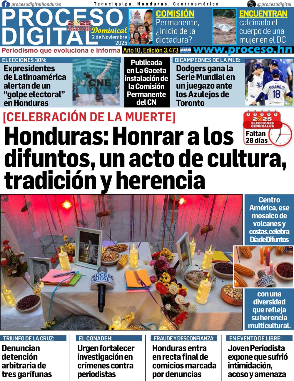 Portada DigitalPortada Domingo 02.11.2025Por: Proceso Digital1 de noviembre de 2025FacebookTwitterWhatsAppEmailImpresión Noticias recientes Jose S. AzconaGobernar requiere más que ganar elecciones René Alfredo SotoTegucigalpa una capital muy vulnerable al cambio climático PolíticaNo es una Comisión Permanente la que va a decidir al próximo presidente: Asociación de pastores CalienteDetienen a tres personas por suponerlos responsables de rapto y asesinato de menor en la capital Frase del día“Lo único que será ‘permanente’ de esa comisión (dictadura legislativa) será el repudio que sentimos por ella”.