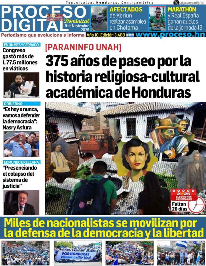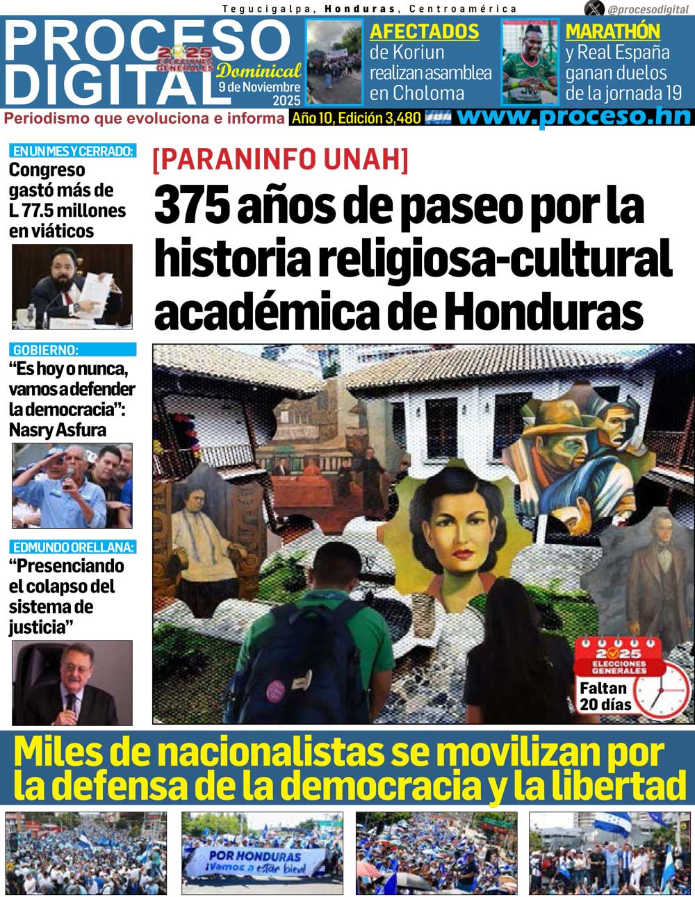 Portada DigitalPortada Domingo 09.11.2025.Por: Proceso Digital8 de noviembre de 2025FacebookTwitterWhatsAppEmailImpresión Noticias recientes FarándulaMiles de mexicanos llenan el Zócalo para recordar a Juan Gabriel y su mítico concierto Deportes4-0. El Inter Miami pasa de ronda tras golear al Nashville con doblete de Messi y Allende Liga NacionalMarathón no afloja en pugna por liderato y Real España se afianza en tercer puesto DeportesLeyendas del Barcelona vencen a las del Real Madrid en un clásico español en El Salvador Crónicas de un periodistaLa victoria demócrata en EEUU es un varapalo y un aviso para Trump, a pesar que el presidente no estaba en las urnas