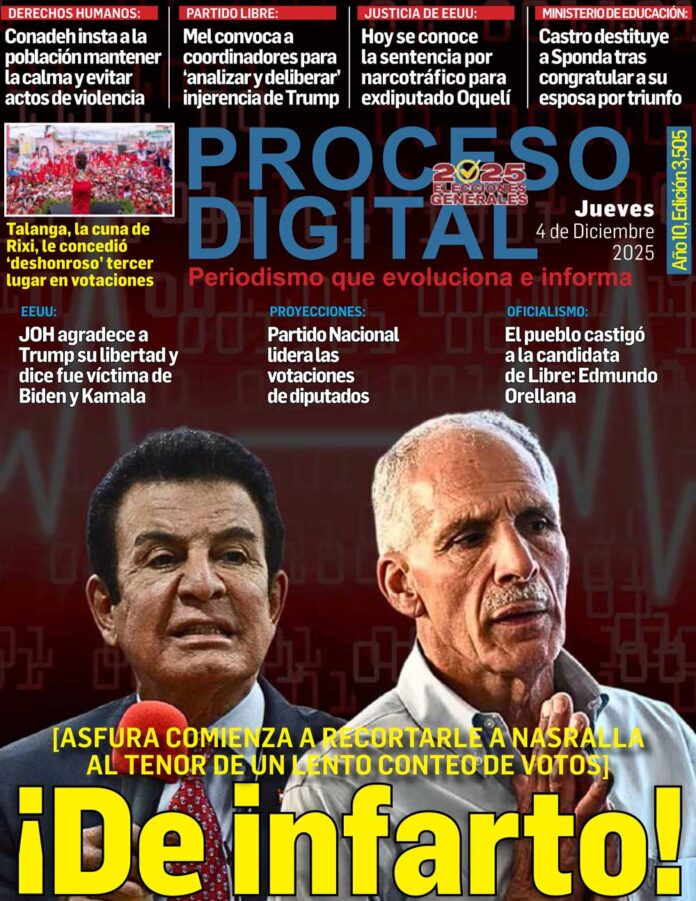 Portada DigitalPortada Jueves 04.12.2025.Por: Proceso Digital3 de diciembre de 2025FacebookTwitterWhatsAppEmailImpresión Noticias recientes DeportesEl argentino Berterame le da triunfo al Monterrey de Sergio Ramos sobre el campeón Toluca DeportesFlamengo conquista su noveno título del Campeonato Brasileño y lo suma a la Libertadores NacionalesUno de los pecados más grandes que tuve en el gobierno fue enamorarme de una persona de otro partido político: Sponda DeportesEl argentino Ángel Correa le da el empate a Tigres UANL ante Cruz Azul Liga NacionalOlimpia y Génesis rescatan empates ante los equipos olanchanos