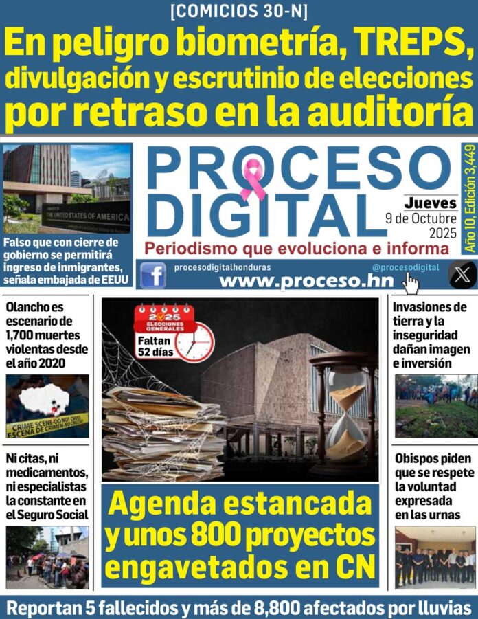 Portada DigitalPortada Jueves 09.10.2025.Por: Proceso Digital8 de octubre de 2025FacebookTwitterWhatsAppEmailImpresión Noticias recientes NacionalesDirector de la Policía pide disculpas públicas a Catacamas por escalada de violencia NacionalesTribunal de Apelaciones de California revoca orden de liberación para Matta Ballesteros PolíticaEn peligro biometría, TREPS, divulgación y escrutinio de elecciones por retraso en auditoría NacionalesLa Policía de Honduras promete justicia por el asesinato del ambientalista Juan López PolíticaAgenda estancada y 800 proyectos engavetados en CN