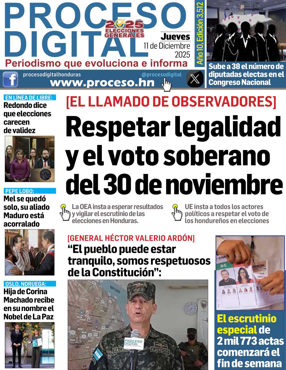 Portada DigitalPortada Jueves 11.12.2025.Por: Proceso Digital10 de diciembre de 2025FacebookTwitterWhatsAppEmailImpresión Noticias recientes DeportesUruguay rinde homenaje a ‘el Maestro’ Tabárez y a su cuerpo técnico InternacionalesDe Venezuela a Curazao, EEUU y Noruega: la odisea de Machado por el Premio Nobel de Paz PolíticaLos miembros de Libre están desesperados tras derrota en elecciones: Tomás Zambrano PolíticaNasralla dice que el Partido Liberal ganó ampliamente las elecciones en Honduras Liga Nacional0-1. con gol del “Toro”, Olimpia vence con lo justo al Real España en el inicio de la triangular