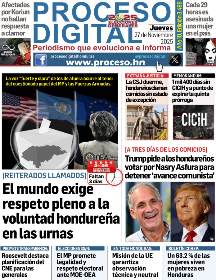 Portada DigitalPortada Jueves 27.11.2025.Por: Proceso Digital26 de noviembre de 2025FacebookTwitterWhatsAppEmailImpresión Noticias recientes PolíticaNo a la repetición de elecciones generales, Libre quiere destruir la democracia: Maribel Espinoza PolíticaJorge Cálix rechaza propuesta de repetir las elecciones que hace Nasralla MigrantesArzobispo de Miami pide a Trump una tregua de las deportaciones de inmigrantes por Navidad PolíticaProcurador está fuera de cualquier tipo de contexto legal PolíticaLuis León: Ni el artículo 295 ni el 296 contemplan que una JEVR pueda anular un acta