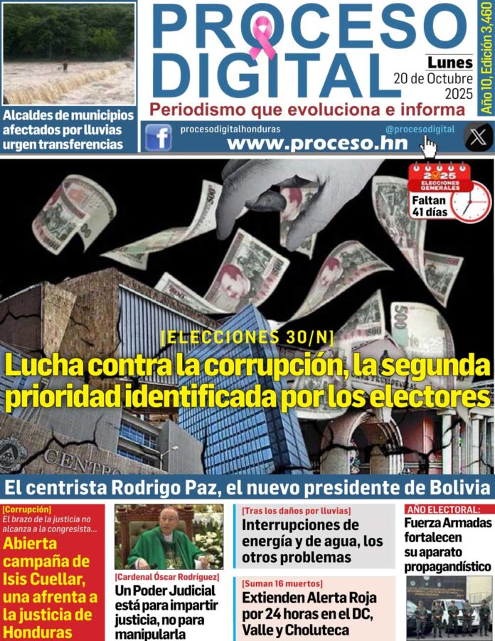 Portada DigitalPortada Lunes 20.10.2025.Por: Proceso Digital19 de octubre de 2025FacebookTwitterWhatsAppEmailImpresión Noticias recientes EconomíaExpresidente de la CCIC denuncia aumento adicional de $200 millones en bono soberanos PolíticaMario Morazán confirma que el TJE ha tenido sesiones virtuales NacionalesLucha contra la corrupción, la segunda prioridad identificada por los electores PolíticaPasamos de la narcodictadura al narcofamilión: Jorge Cálix NacionalesDesplazamiento forzado de docentes, una amenaza invisible a la educación