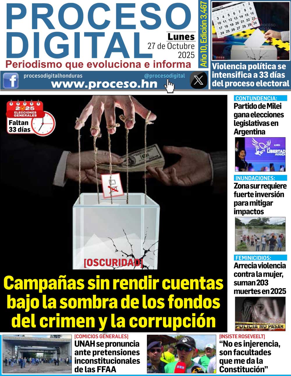 Portada DigitalPortada Lunes 27.10.2025.Por: Proceso Digital26 de octubre de 2025FacebookTwitterWhatsAppEmailImpresión Noticias recientes InternacionalesEl presidente de Guatemala afirma que se busca llevar un golpe de Estado en su contra PolíticaCampañas sin rendir cuentas bajo la sombra de los fondos del crimen y la corrupción MigrantesIncertidumbre por voto en el extranjero, hondureños en EEUU denuncian errores en el censo Liga NacionalOlimpia vence 2-1 al Real España y mantiene el liderato del torneo Apertura CalienteUn muerto y tres heridos en tiroteo en La Entrada, Copán