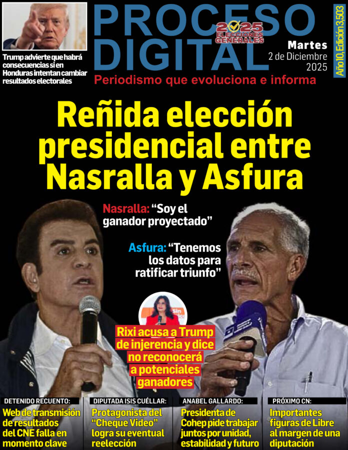Portada DigitalPortada Martes 02.12.2025.Por: Proceso Digital1 de diciembre de 2025FacebookTwitterWhatsAppEmailImpresión Noticias recientes Yanivis Melissa IzaguirreDe constructor de victorias a destructor de partidos… Libre vuelve a ser Resistencia Frase del día“Las elecciones no están perdidas, el bipartidismo nos impuso su trama electoral siguiendo la trampa develada en los 26 audios alterando el sistema de... PolíticaRixi acusa a Trump de injerencia y dice que no reconocerá a ninguno de los potenciales ganadores PolíticaGrupo ASD, encargado de transmitir los datos los datos electorales, avisa de anomalías por tráfico en la web PolíticaTrump advierte que habrá consecuencias si en Honduras intentan cambiar resultados electorales