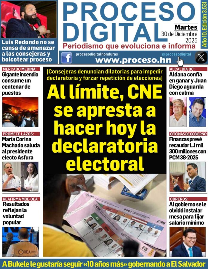 Portada DigitalPortada Martes 30.12.2025.Por: Proceso Digital29 de diciembre de 2025FacebookTwitterWhatsAppEmailImpresión Noticias recientes InternacionalesEEUU atacó con drones de la CIA un puerto en Venezuela, según el New York Times PolíticaAl límite, CNE se apresta a hacer declaratoria electoral PolíticaJefe de bancada nacionalista denuncia convocatoria de diputados suplentes de Libre NacionalesPresidente electo dona 1.5 millones a afectados por incendio en mercado Medina InternacionalesTaiwán confirma disparos con munición real de China en área delimitada al norte de la isla