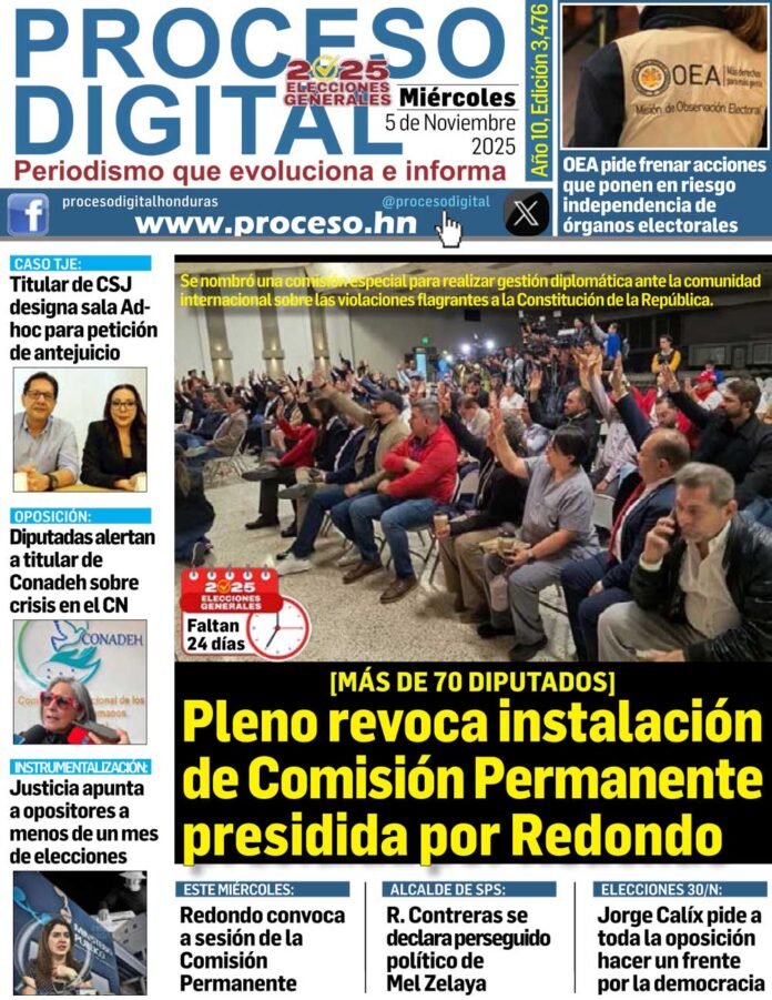 Portada DigitalPortada Miércoles 05.11.2025.Por: Proceso Digital4 de noviembre de 2025FacebookTwitterWhatsAppEmailImpresión Noticias recientes Al DíaEstados Unidos sanciona a diez banqueros e instituciones de Corea del Norte por blanqueo MigrantesAgentes de migración de EEUU detienen a un pastor episcopal, pese a tener un estatus legal InternacionalesTrump reconoce la derrota republicana en elecciones locales y culpa al cierre del gobierno InternacionalesEl progresista Mamdani gana las elecciones a la Alcaldía de Nueva York, según proyecciones Columnista invitadoLa ilegitimidad de la Comisión Permanente y su impacto en la crisis electoral
