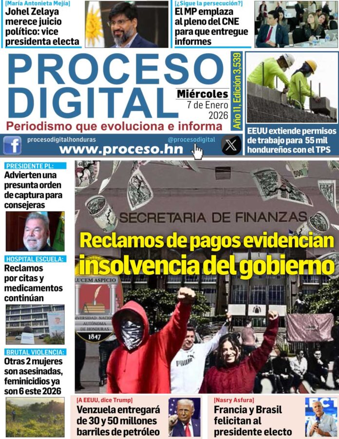 Portada DigitalPortada Miércoles 07.01.2026.Por: Proceso Digital6 de enero de 2026FacebookTwitterWhatsAppEmailImpresión Noticias recientes VenezuelaCabello dice que «hasta ahora» son cien los fallecidos en el ataque de EEUU a Venezuela Liga Nacional1-0. Olimpia vence por la mínima al Marathón y ogra su 40º título de Liga Nacional PolíticaDiputado Umaña califica convocatoria a sesión de Comisión Permanente como un “confite envenenado” PolíticaAsociación de Alcaldes Nacionalistas respaldan candidatura de Zambrano para presidir el CN VenezuelaPetro habló con Delcy Rodríguez y le propuso un diálogo tripartito con Estados Unidos