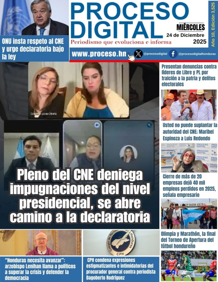 Portada DigitalPortada Miércoles 24.12.2025Por: Proceso Digital23 de diciembre de 2025FacebookTwitterWhatsAppEmailImpresión Noticias recientes PolíticaHall alerta intento de frenar la declaratoria presidencial PolíticaLibre es el peor error que ha cometido el país y esperamos sea el último: Tomás Zambrano PolíticaZelaya acusa al CNE de actuar sin quórum y de “consumar un golpe electoral” PolíticaPartido Nacional reafirma respaldo a consejeras del CNE y se mantiene firme en defender la democracia: María Antonieta Mejía PolíticaConsejera del CNE denuncia intento de secuestro de datos electorales para frenar la declaratoria de las elecciones 2025