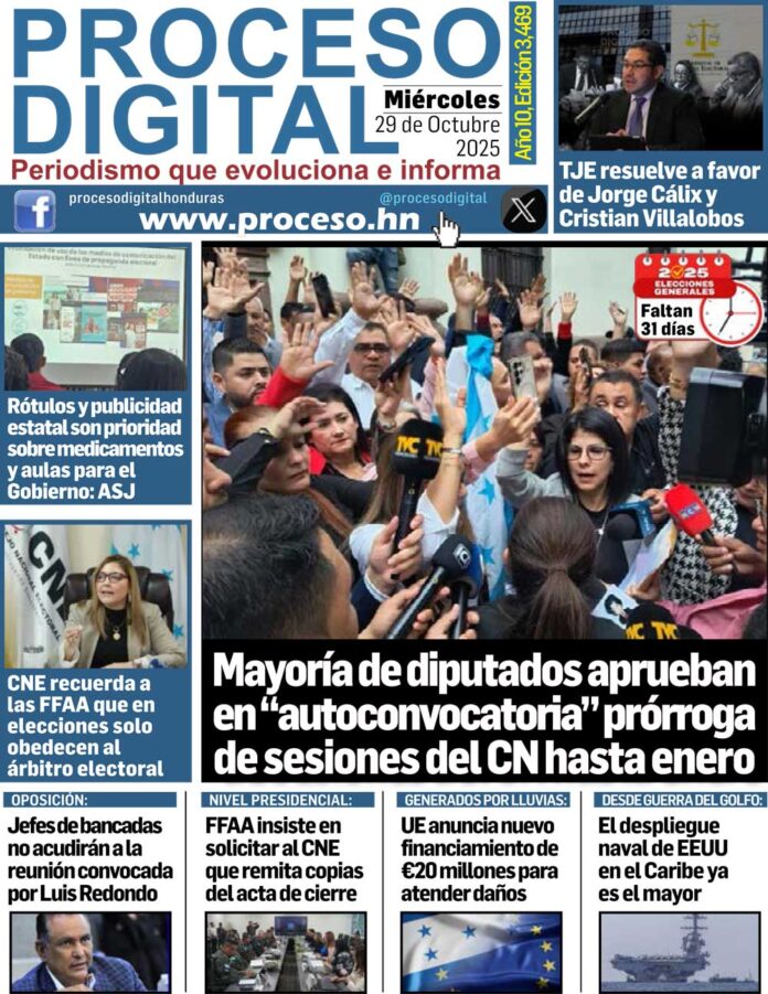 Portada DigitalPortada Miércoles 29.10.2025.Por: Proceso Digital28 de octubre de 2025FacebookTwitterWhatsAppEmailImpresión Noticias recientes NacionalesPN pide un alto al uso del MP para amedrentar a magistrados Deportes2-6. Los Azulejos dejan todo igual DeportesCartaginés vence a Motagua y lo elimina de la Copa de Campeones de la Concacaf 2026 EconomíaEEUU revoca trece rutas aéreas de aerolíneas mexicanas por disputas de competencia NacionalesMagistrada del TJE alerta sobre potencial requerimiento y orden de captura en su contra y su par Urrutia