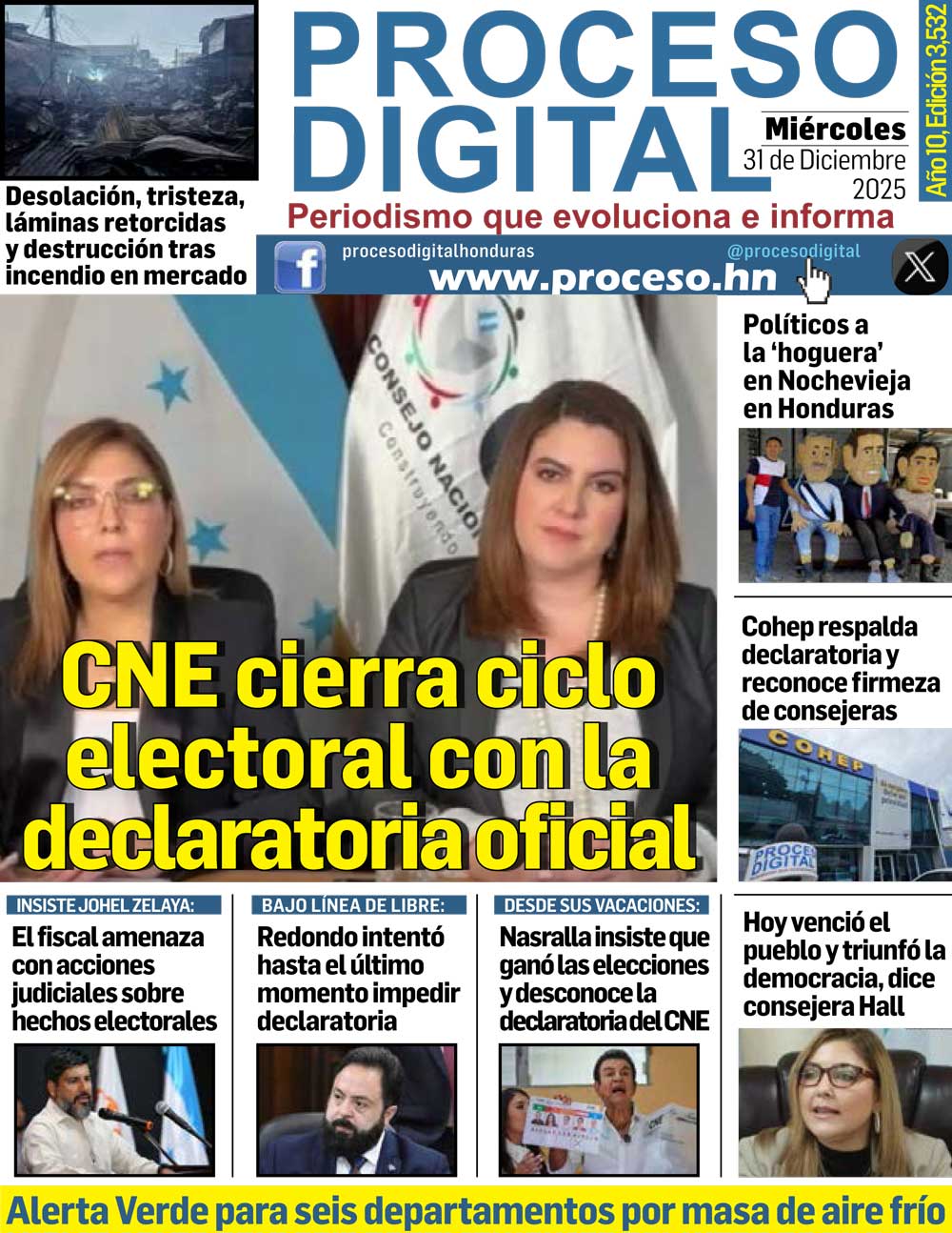 Portada DigitalPortada Miércoles 31.12.2025.Por: Proceso Digital30 de diciembre de 2025FacebookTwitterWhatsAppEmailImpresión Noticias recientes PolíticaPartido Nacional pide a diputados y alcaldes electos que sirvan con grandeza, visión y responsabilidad PolíticaSe ha consumado el golpe electoral, reacciona Rixi Moncada a la declaratoria del CNE PolíticaEncargada de negocios de embajada de EEUU conversa con el presidente electo Asfura PolíticaAldana afirma que no dejará la alcaldía del Distrito Central hasta que se cuente cada acta Política“Vamos a hacer el mejor gobierno que haya tenido este país”: Tomás Zambrano