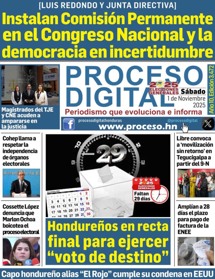Portada DigitalPortada Sábado 01.11.2025.Por: Proceso Digital1 de noviembre de 2025FacebookTwitterWhatsAppEmailImpresión Noticias recientes PolíticaHondureños en recta final para ejercer “voto de destino” PolíticaLuis Redondo instala la Comisión Permanente y la democracia en incertidumbre Al DíaAyuda en Acción presenta en foro de la OEA estudio sobre prácticas comunitarias que protegen a la niñez y a las mujeres en Honduras PolíticaNasry Asfura destaca que un presidente debe ser un aliado de la empresa privada para generar empleo InternacionalesEEUU parece aumentar presión militar en el Caribe y crece el temor a que ataque Venezuela