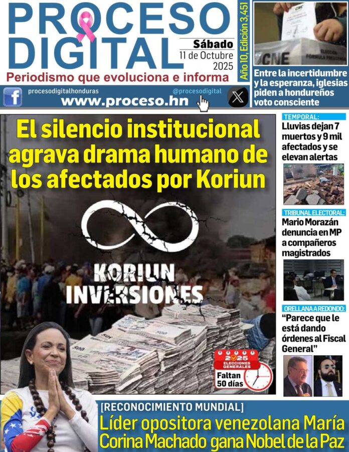 Portada DigitalPortada Sábado 11.10.2025.Por: Proceso Digital10 de octubre de 2025FacebookTwitterWhatsAppEmailImpresión Noticias recientes InternacionalesLos letales drones MQ-9 Reapers desplegados en Puerto Rico NacionalesAlerta Roja en barrios y colonias en la ribera del Río Choluteca Al DíaLa guerra arancelaria entre China y EEUU deja la peor caída en Wall Street desde abril DeportesNicaragua incorpora a Ariel Arauz y a Marlon López para el partido contra Costa Rica Deportes0-1. Panamá vence a El Salvador y sube al segundo lugar en el Grupo A de la Concacaf