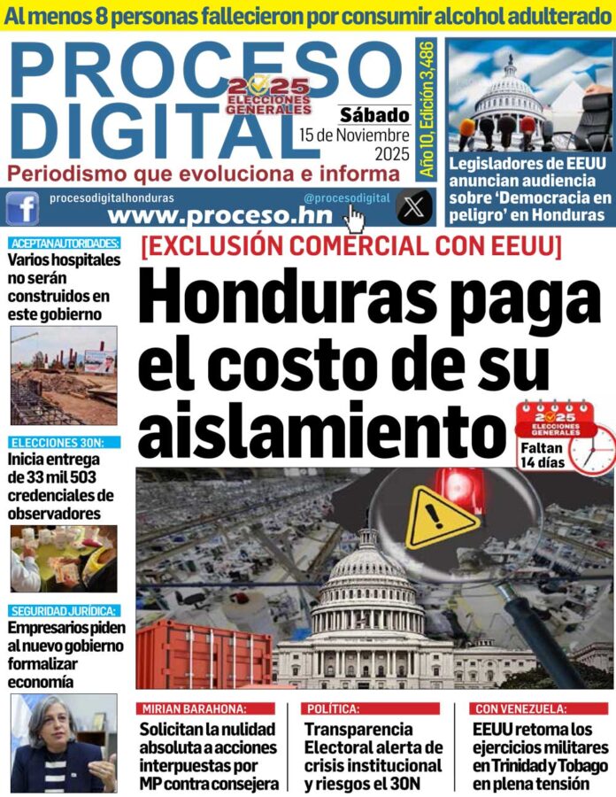 Portada DigitalPortada Sábado 15.11.2025.Por: Proceso Digital14 de noviembre de 2025FacebookTwitterWhatsAppEmailImpresión Noticias recientes EconomíaExportadores de café aplauden inclusión de Honduras en eliminación de arancel al café NacionalesTres nuevas empresas de transporte ofertan ante el CNE Ciencia y TecnologíaEl nivel de alerta por la tormenta solar disminuye a «leve» y continuará hasta el lunes MigrantesZar fronterizo de EEUU rechaza críticas de obispos católicos sobre deportaciones masivas EconomíaHonduras paga el costo de su aislamiento: exclusión comercial con EEUU