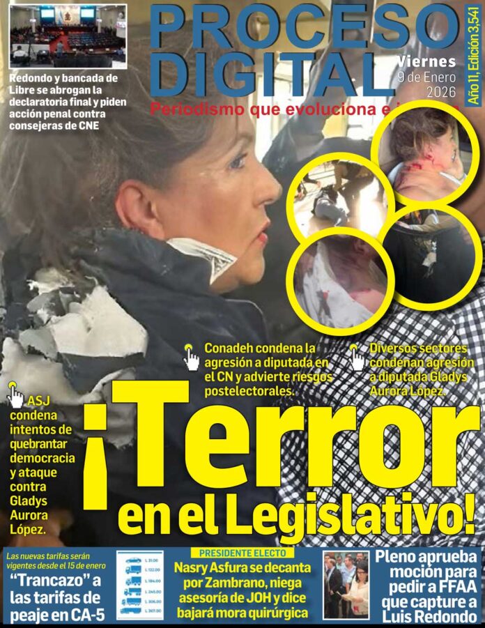 Portada DigitalPortada Viernes 09.01.2026.Por: Proceso Digital9 de enero de 2026FacebookTwitterWhatsAppEmailImpresión Noticias recientes VenezuelaLa defensa de Maduro dice que abogado Bruce Fein no fue autorizado a sumarse al caso SaludPor qué el IHSS no construyó un tan solo centro regional teniendo disponibilidad de $500 millones, cuestiona Carlos Aguilar InternacionalesTrump dice que se reunirá con Petro en la Casa Blanca la primera semana de febrero PolíticaInterponen recurso de amparo contra inadmisión del TJE en perjuicio del excandidato liberal Salvador Nasralla NacionalesEjecutan operación para liberar vías en salidas de Tegucigalpa