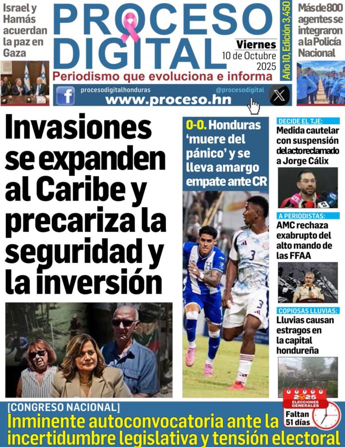 Portada DigitalPortada Viernes 10.10.2025.Por: Proceso Digital9 de octubre de 2025FacebookTwitterWhatsAppEmailImpresión Noticias recientes InternacionalesEl Congreso de Perú destituye de manera exprés a la presidenta Dina Boluarte InternacionalesEl Congreso de Perú convoca a la presidenta Boluarte para un proceso de destitución exprés Deportes0-3. Haití se divierte en Managua y alcanza el liderato del Grupo C Actualidad0-0. Un insípido empate en SPS amarga a Honduras en sus aspiraciones a United 2026 Al DíaTaiwán anuncia un nuevo sistema avanzado de defensa aérea para contener a China