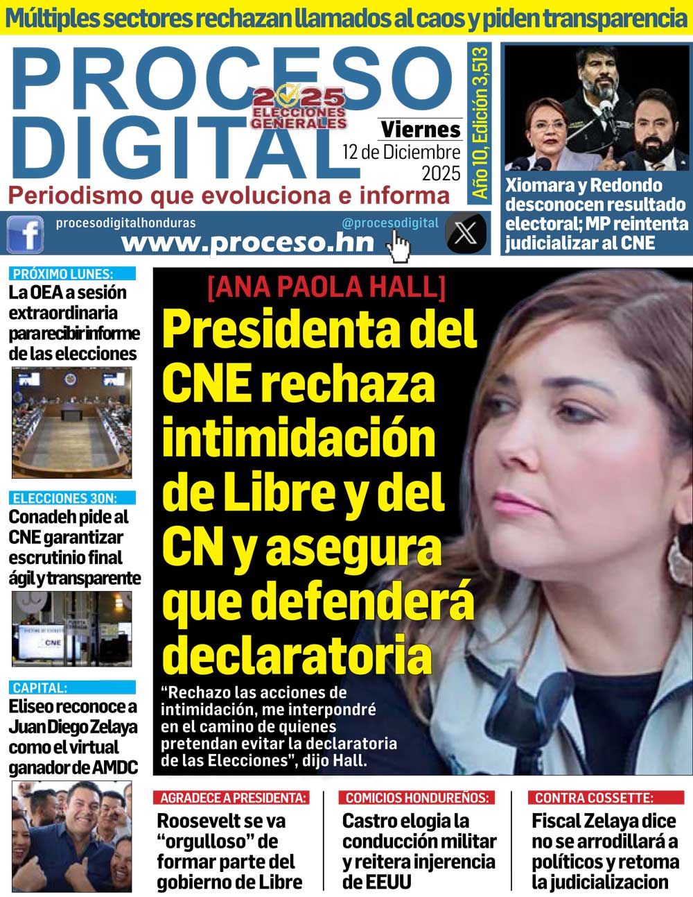 Portada DigitalPortada Viernes 12.12.2025.Por: Proceso Digital11 de diciembre de 2025FacebookTwitterWhatsAppEmailImpresión Noticias recientes PolíticaMinisterio Público desmiente existencia de requerimiento fiscal contra consejeras del CNE NacionalesTeletón de Honduras espera recaudar 2.9 millones de dólares para atender seis centros PolíticaJefes de bancada del Partido Nacional y Liberal expresan preocupación por rumores de órdenes de captura contra consejeras del CNE InternacionalesFiscal de EEUU ordena crear lista de «terroristas domésticos» y sistema de recompensas PolíticaGustavo Solórzano cuestiona actuación del MP y advierte contaminación de pruebas en caso de audios