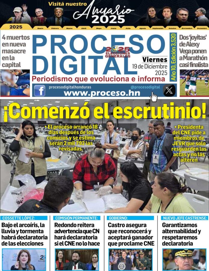 Portada DigitalPortada Viernes 19.12.2025.Por: Proceso Digital18 de diciembre de 2025FacebookTwitterWhatsAppEmailImpresión Noticias recientes PolíticaLuis Redondo reitera advertencia que CP hará declaratoria de elecciones, sí el CNE no lo hace PolíticaDiputados convocan a sesión extraordinaria del Congreso Nacional ante “impedimento ilegal” de la Junta Directiva Liga NacionalMarathón golea a Platense con dos ‘joyitas’ de Alexy Vega y acaricia la final del Apertura CalienteCuatro personas son asesinadas dentro de su vivienda en la Residencial Centroamérica Ciencia y TecnologíaToyota aspira a vender en Japón tres modelos de coches fabricados en EEUU a partir de 2026