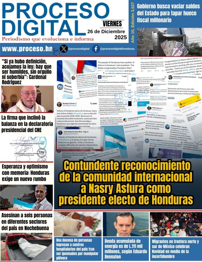 Portada DigitalPortada Viernes 26.12.2025Por: Proceso Digital25 de diciembre de 2025FacebookTwitterWhatsAppEmailImpresión Noticias recientes Cifra del día12 personas Liga NacionalOlancho FC vence a Platense en la penúltima fecha de las triangulares del Apertura Ciencia y TecnologíaExpertos de UNAM «observan» mediante tomografía con IA cámaras magmáticas del Popocatépetl Al DíaRusia necesitará más de 12 millones de trabajadores en los próximos años, dice Putin InternacionalesTrump anuncia que EE.UU. atacó campamentos del grupo terrorista ISIS en Nigeria