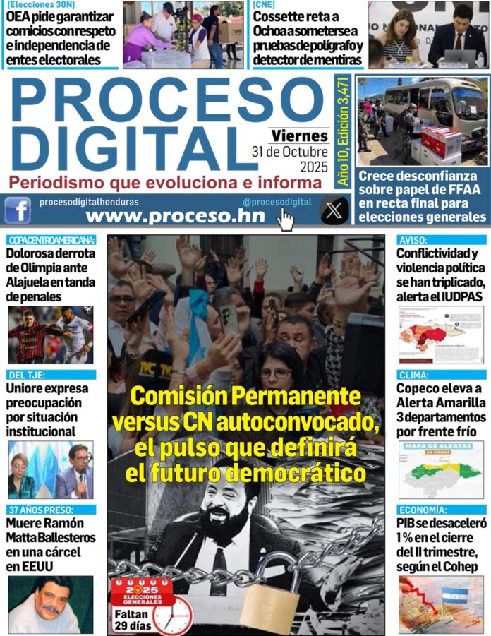 Portada DigitalPortada Viernes 31.10.2025.Por: Proceso Digital31 de octubre de 2025FacebookTwitterWhatsAppEmailImpresión Noticias recientes NacionalesTomada la CA-5 por transportistas que prestaron servicio en elecciones primarias al CNE PolíticaDiputado Umaña cuestiona que nuevas funciones a las FF.AA. no están en Constitución CalienteA balazos asesinan a conductor de mototaxi en la colonia Torocagua NacionalesPor masa de aire frío se pronostican lluvias y temperaturas frescas en gran parte del país PolíticaConsejera López denuncia persecución y tortura psicológica