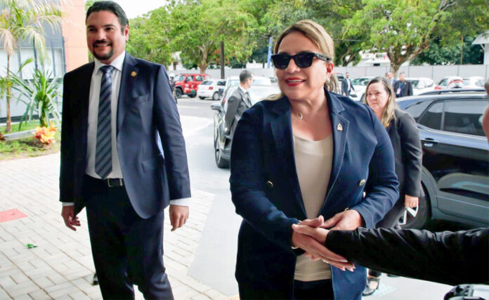 La titular del Ejecutivo es acompañada en esta cumbre por el secretario privado Héctor Manuel Zelaya y el canciller Javier Bu Soto, entre otros.