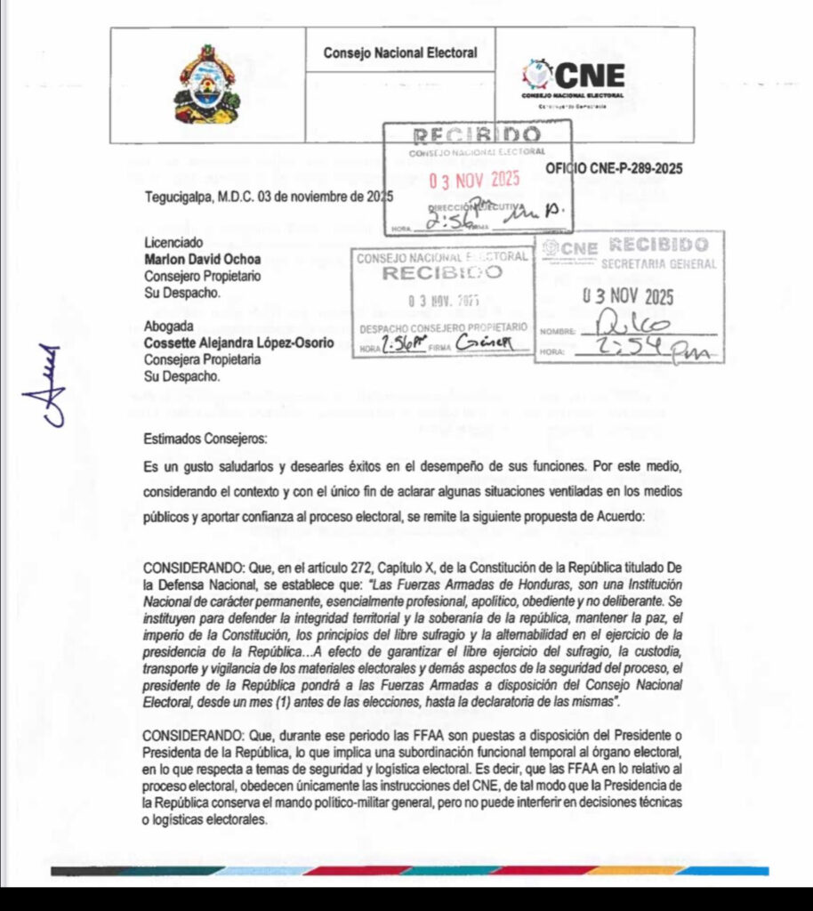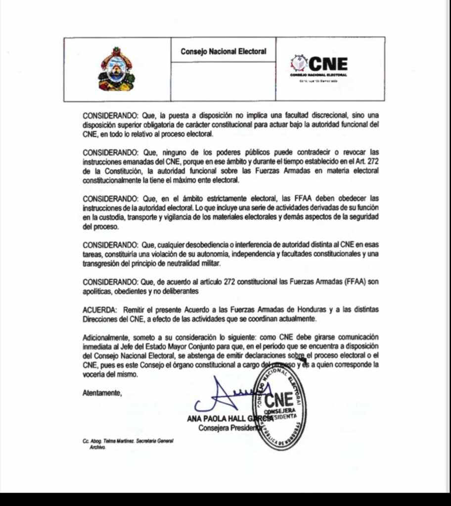 Tegucigalpa – La presidenta del Consejo Nacional Electoral (CNE), Ana Paola Hall, envió hoy una carta a los consejeros Marlon Ochoa y Cossette López en la que solicita aclarar situaciones ventiladas en los medios de comunicación.